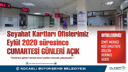 Kocaeli genelindeki beş seyahat kartları ofisi, Ulaşım Dairesi Başkanlığı bünyesinde vatandaşların kart işlemleri için hizmet veriyor. Kocaeli genelinde İzmit Merkez, İzmit Umuttepe (Kocaeli Üniversitesi), Gölcük, Derince ve Gebze Merkez, Seyahat Kartları Ofisleri hafta içi günlerinde vatandaşların kart işlemlerini gerçekleştiriyor. Okulların açıldığı Eylül ayında vatandaşların yoğunluk yaşamadan işlemlerini yapabilmesi için bu beş ofis, Cumartesi günleri de normal mesai zamanı olan 08.30 – 17.30 saatleri arasında hizmet verecek.