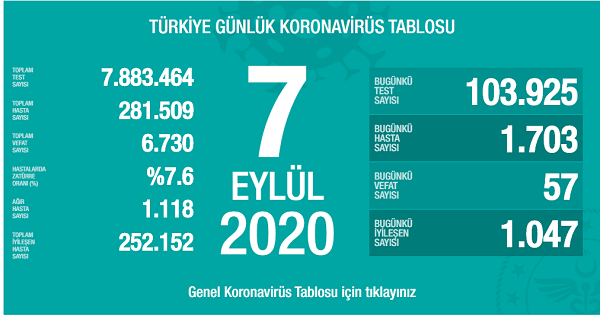 Sağlık Bakanı Fahrettin Koca koronavirüs (corona virüs) nedeniyle son 24 saatte 57 kişinin hayatını kaybettiğini, toplam can kaybı sayısının 6 bin 730’a yükseldiğini açıkladı. Toplam vaka sayısı ise 1703 artarak 281 bin 509’a çıktı. 1047 kişinin de virüsü yendiğini belirten Bakan Koca, toplam iyileşen hasta sayısının 252 bin 152 olduğunu bildirdi.