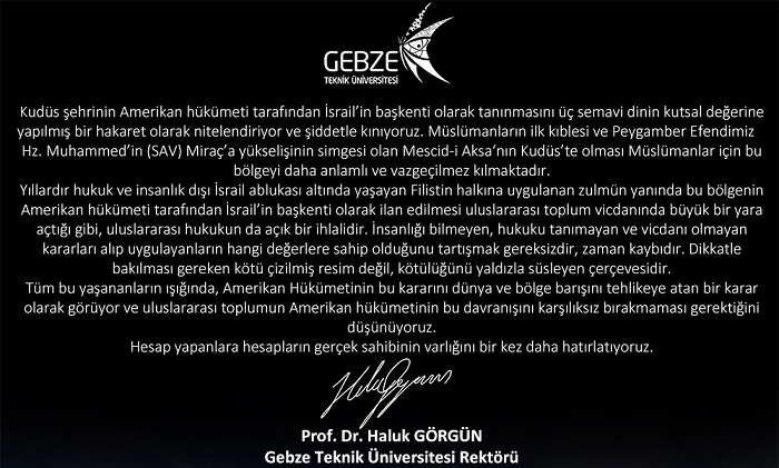 Gebze Teknik Üniversitesi Senatosu ABD’nin Kudüs’ü başkent olarak tanıma kararını kınayan bir bildiri yayınladı.